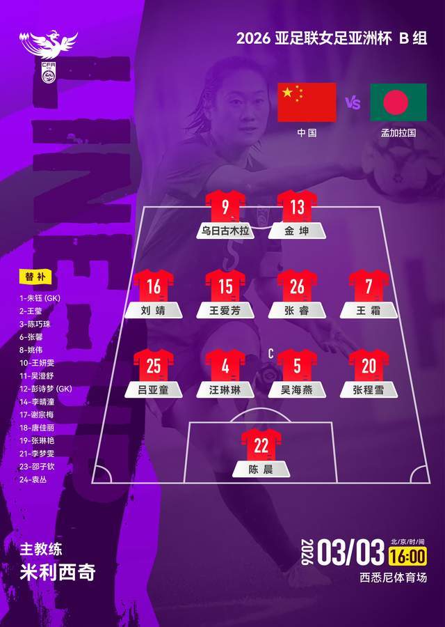 2024年5月,澳大利亚人米利西奇成为中国女足新一任主教练,他的战术设置偏好是3421,不过鉴于目前中国女足的整体实力,其更多的采取442的战术。王霜主打边前卫的位置。今天下午的首发阵容是:门将陈晨。后防线:张程雪和吕亚童打两个边后卫,队长吴海燕和王琳琳组成双中卫。前场:王霜和刘靖打两个边前卫,张睿和王爱芳组成双后腰。前锋是金坤、乌日古木拉。